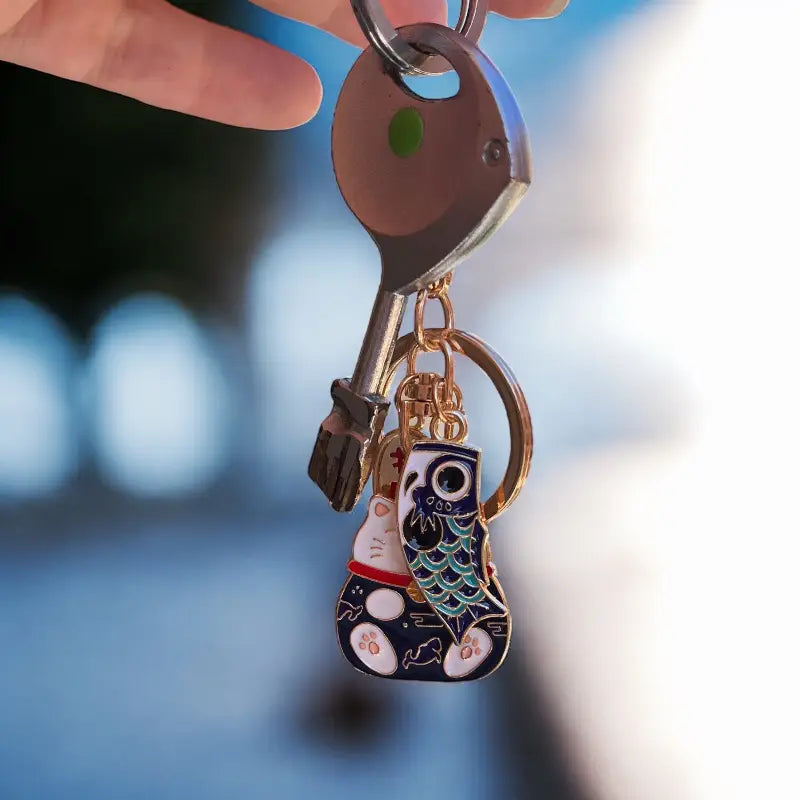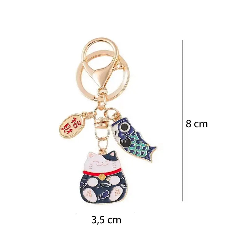 Ce joli porte-clés représente un chat Maneki Neko noir et un petit poisson koi, deux symboles puissants de la culture japonaise. Le chat qui lève la patte est connu pour attirer la chance et la prospérité et le poisson, quant à lui, est souvent associé à l’abondance et à la persévérance. L’ensemble est travaillé en métal doré avec un bel effet émaillé, qui lui donne un aspect à la fois élégant et kawaii. Vous pouvez choisir entre deux systèmes d’attache solides, un anneau et un mousqueton, pour accrocher ce joli félin à votre trousseaux ou à la fermeture éclair d’un sac. Comme il est compact sans être trop petit, il remplit parfaitement son rôle sans vous encombrer les poches !