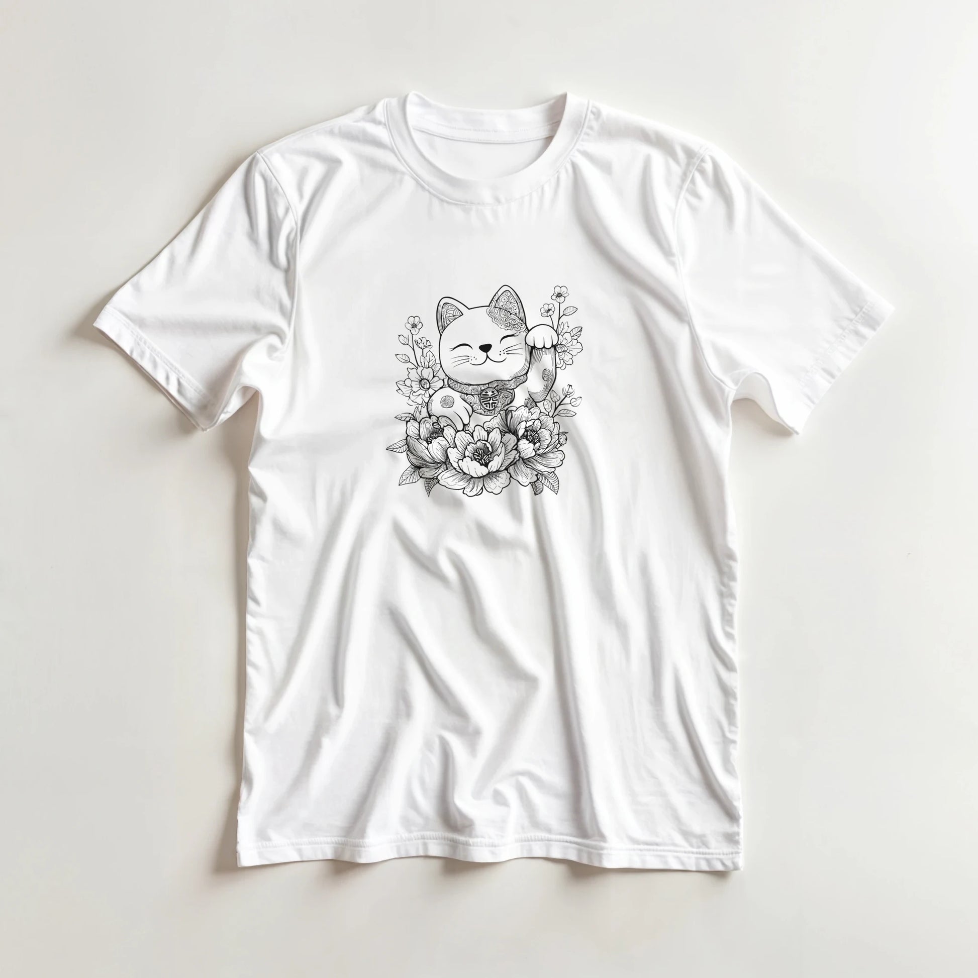T-shirt chat chanceux et fleurs : un design poétique et porte-bonheur